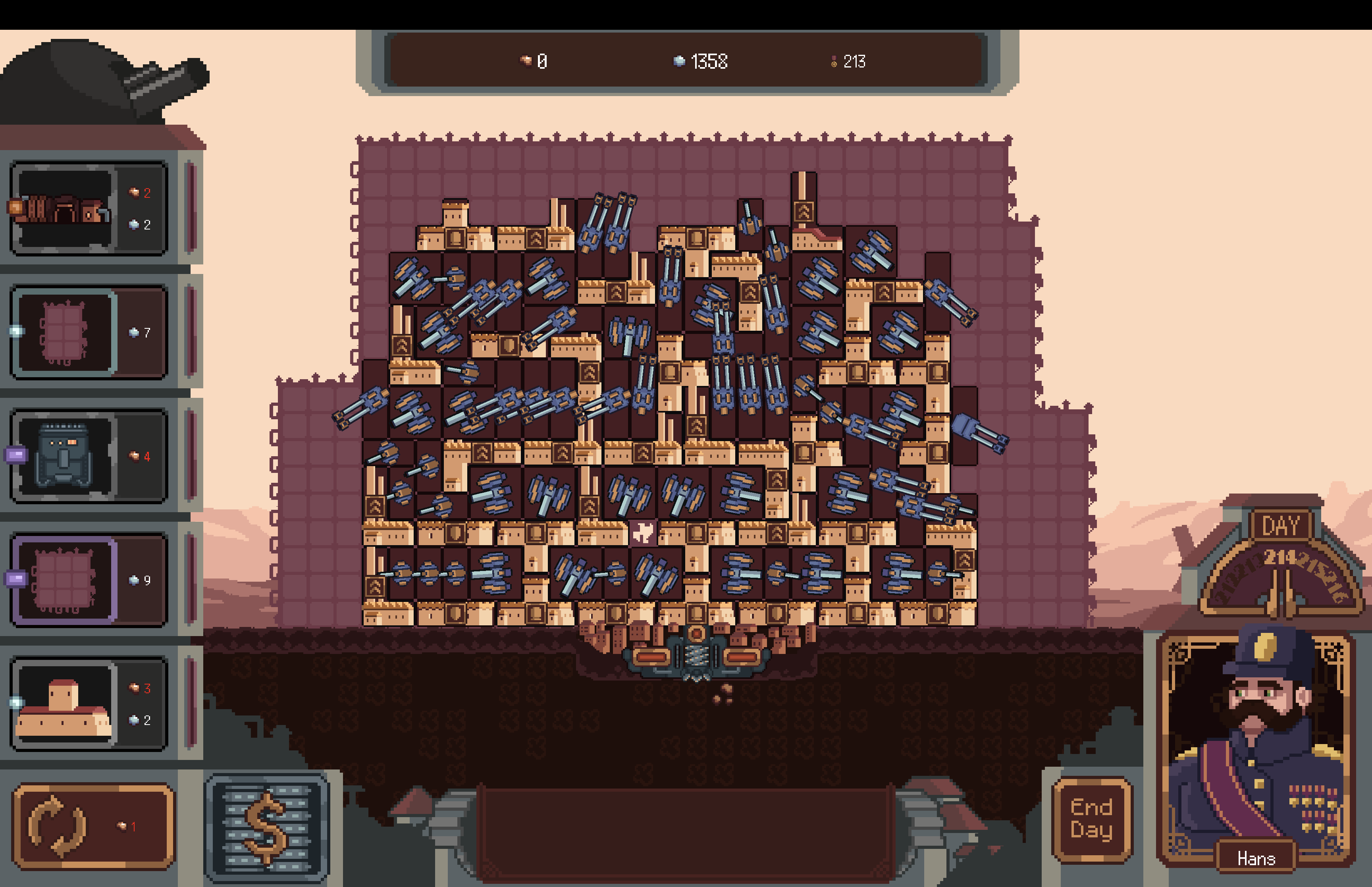 Manage your pool of buildings by locking items and rearrange your city to fit your strategy.